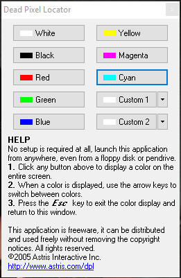 Dead Pixel Locator is another portable dead pixel checker software. It’s interface provides the buttons to choose a color to run the test. 7 buttons are glued with default added colors. However, there are two buttons that you can use to change the colors using the color palette.