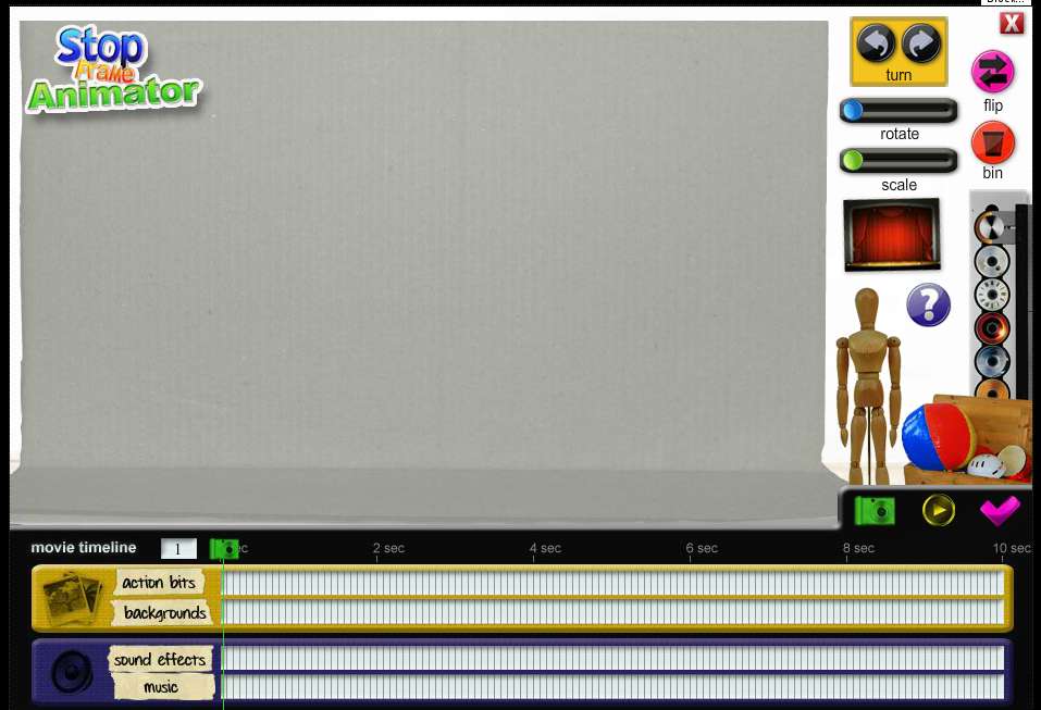 Interface of Stop Frame Animator can be seen on the image above. Bottom of the windows holds a timeline for both audio and video. On the right you have menu with props, and the main star, notice that manikin standing next to a chest full of stuff? Those are the figure and props that you’re gonna be able to use in your animation. Rest of the interface is reserved for workspace where you’ll be able to actually edit the animation that you’re creating. Key features of this free online animator are: