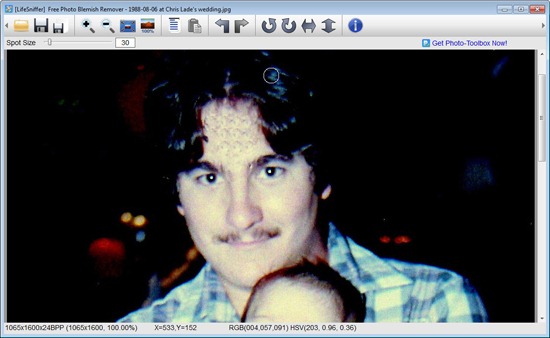 Photo Blemish Remover is a free software to remove blemishes from photos. You’ve got the awesome background, and you are wearing your favorite clothes. You love the pose. Then, you notice a blemish on your photo. You COULD go through the hassle of launching Adobe’s Photoshop to fix the picture. If the blemish is really small, you could launch Photo Blemish Remover from LifeSniffer.