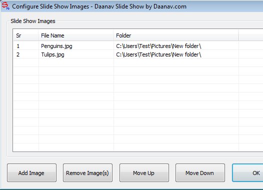 Click on the Add Image Button to import photos to the list. Use the Move Up and Move Down buttons in order to adjust the order in which images, meaning slides, will be displayed. When you’re done close that window and open up Edit >> Slide Show Setting. There you will see only one option, Slide Change Interval. Set it to your liking and close the window. Slide show can be activated by clicking on View >> Start / Stop Slide Show.
