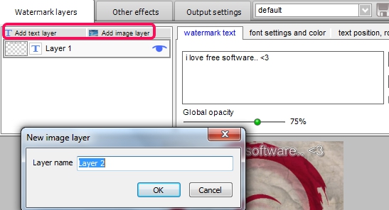 After you have added images, you need to add watermark layers. Maximum two watermark layers can be added with this free version of Easy Watermark Studio. It’s your own wish whether you want to add both text/image layers or one text and one image layer. Give a name to added layer and move further.