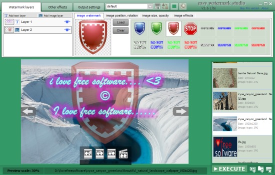 Easy Watermark Studio Lite is a handy software to watermark photos in bulk with text, image, and some useful effects. You can add two layers of watermark, either both text/image layers or one text layer and one image layer, and can watermark photos. For each added layer, you will able to set settings & color, position, rotation, text effects, and image effects.