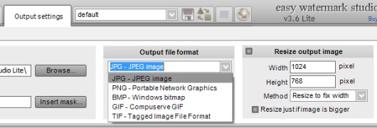 - You can also select output destination location, output format (jpg, png, tif, gif, and bmp), width and height for output watermark photo.