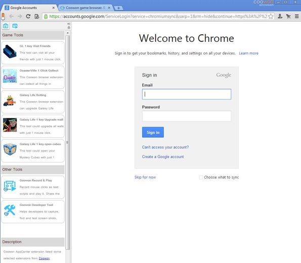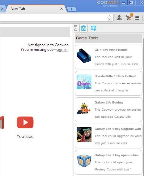 App Center lists additional extensions that you can install, which were not added by default. These are specialized extensions for specific online games like CoasterVille and Galaxy Life. Coowon Game Browser is aimed at those players who play web browser based online games (games that are played inside the web browser).