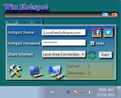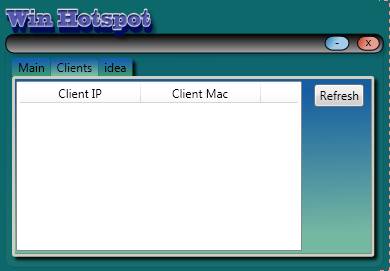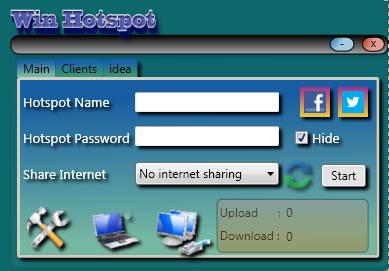 Image above shows the interface of Winhotspot. It features a tabbed type of interface where at the top of the window you can switch between the main window, the one that can be seen above. This is where you’ll be setting up your very own wireless ad-hoc network. The next tab on the list would be the Clients tab, this is where you can track who’s connected to the wireless network that you’ve created. The last Idea tab is for suggestions to the Win Hotspot developer.