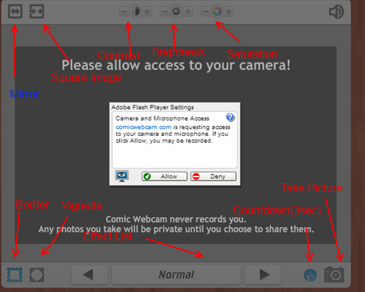 It is a Chrome application, so just visit Chrome webstore and search for Comic Webcam. Then first click on Add to Chrome and then on Launch the application. The tab will appear in your Chrome homepage. Clicking on that the app will open up asking you for permission to access your webcam like shown in the screenshot above. Clicking on Allow, you will be able to see yourself on the screen. You can then choose the effect you want by clicking on the arrow and take a picture by clicking on the button as shown above.