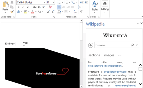 Wikipedia is a free add-in of Microsoft Office and especially for MS Word and Excel which lets you search for Wikipedia articles within Office. By it, you can easily insert text from Wikipedia articles to Word documents and Excel sheets and it automatically quotes the Wikipedia source as well. This certainly makes it a must have Office add-in for students and professionals for doing the research work within MS Office and to quote text and images from Wikipedia articles to their documents.