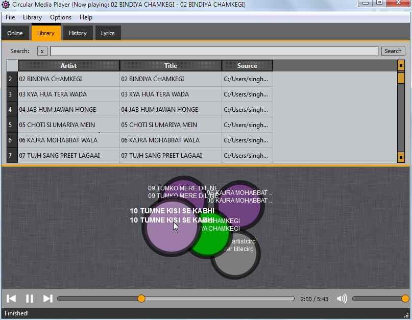In Circular Media Player, you also have the option to search for the songs online. Also, you can see the history. In history the last played songs will be displayed. If you want to see the lyrics of a song , then you can see the lyrics using the lyrics tab in Circular Media Player. The basic options of jumping to the next and previous song is also available. To make a playlist just drag the songs from the library and drop it in the colorful circles below the library. Here, the songs will be added and you can save the playlist.