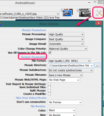AndreaMosaic is a free photo mosaic maker software. There are multiple interesting features that you won’t find with many similar software. It lets you set mosaic resolution (300 DPI, 1200 DPI, 200 PPI, etc.), mosaic size, number of tiles, and number of times a tile should be used for generating your mosaic.