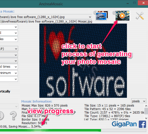 In above screenshot, you can see interface of this software where tiles size, mosaic size, and resolution can be set by you for main image.