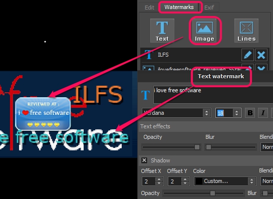 To watermark the images, you can either add any custom text, add an image, or can use both watermarks. For image watermark, it supports bmp, jpg, png, and gif images. Text and image watermark’s position (top left, center, bottom right, etc.), opacity, size can also be adjusted easily.