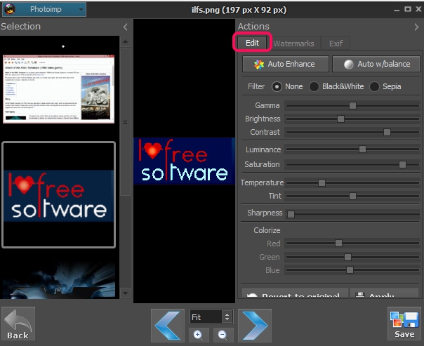 Photoimp is a batch image converter, batch image enhancer, and batch resizer software. It helps to view thumbnail of images available in a particular directory and lets you perform any task on them. For enhancing the images, you can adjust gamma level, brightness, contrast, luminance, saturation, etc. Once images are edited, you can save them to any destination directory. And before saving the images, it lets you resize as well as convert images.
