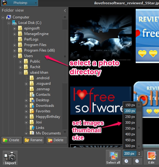 Screenshot above shows beautiful interface of Photoimp where it provides a navigation pane and thumbnails of images.