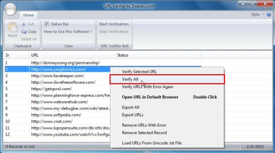 Now open again make a right-click on the interface and choose “Verify All” option to verify all the URLs in one go. You can also click on the “Start verification” button on the ribbon interface for this purpose. If the program gives a connection error due to slow internet connectivity, you can verify independent links also.