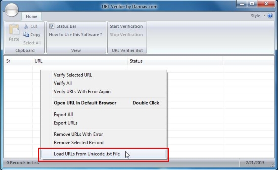 Once the file is ready, you can make a right click somewhere in the center of the URL Verifier’s interface and choose “Load URLs from Unocode.txt File option”. Now browse the file from your system and click “Open”. This will load all the URLs from the Unicode file to URL Verifier for verification.