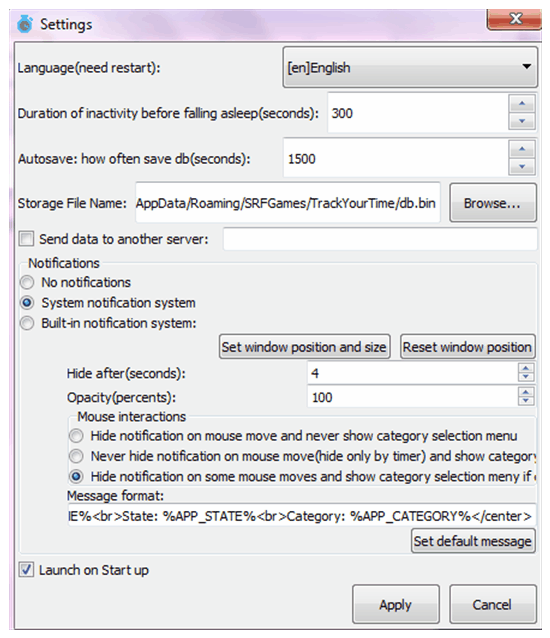 The Settings tab allows a user to choose his preferred language and set the time limit for the duration of inactivity before going on sleep mode. You can also choose the time limit after which the program auto saves the usage data. The Settings tab also gives users the liberty of controlling the notifications and mouse action during operation.