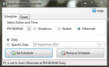 As you can see, it consists of two different tabs. The first tab lets you select a shutdown action and time to schedule shutdown. You can either choose to turn off (shutdown), restart, or hibernate PC. Now here you can also specify whether you want to run the scheduler on daily basis or on a specific date. Once you are done, simply click on the Set Schedule button and you are done.