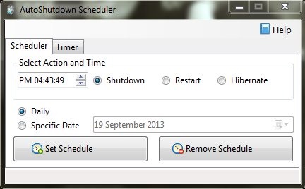 AutoShutdown Scheduler is a free shutdown scheduler that lets you schedule power off, restart, and hibernate operations for your PC. That means, using this simple tool, you can set a time in advance, on which your PC is to turn off, restart, or hibernate automatically. You either specify a particular day on which you want to schedule the Shutdown operation, or set a daily schedule. Apart from that, you can set a Timer in hours or minutes. This will automatically turn off your PC once the timer reaches to 0 (zero).
