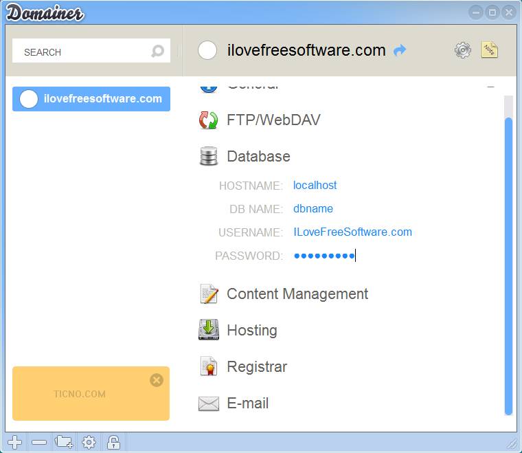 Ticno Domainer is a free web domain and website login information management utility where you can keep all the info that’s important for accessing and running your websites. Domain control panels, hosting accounts, and lastly the content management system login info can be managed and password protected. Ticno Domainer will store all this information and also store links to all of the above mentioned control panels for quick and easy domain and website access.