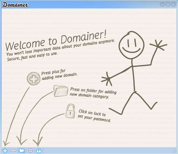 This is the default interface of Ticno Domainer, this is what waits for you after starting it for the first time. Three important tasks that you need to do first are explained and menus are indicated with arrows. Domains can be arranged in folders according to their type. Make sure that you click on the lock icon to set the password for accessing your domains, otherwise anyone could access your information.