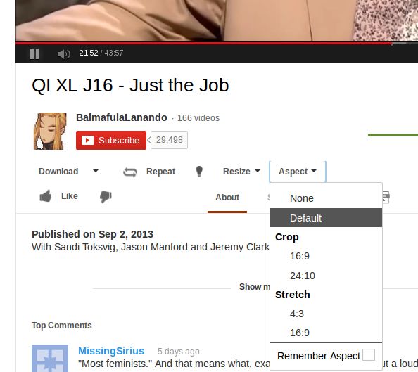 You might not even notice all the options that are gonna be added, because they are themed just like the YouTube design. Next to the video size switcher option, there’s also a couple of other options to the right, video looper and focuser for example. These are just some of the options, to access all the YouTube tweaks that YouTube center has to offer, there’s an additional button in the top right corner of the YouTube interface that you can click.