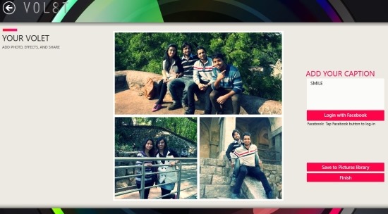 After you have completed the collage and it is of your liking then all you need to do is click on the ‘save to pictures library’ button to save it to your computer and if you would like to post the image to Facebook along with some caption then just enter some text and click on the share to Facebook button. If you are done with this collage and want to over again all you need to do is click on the finish button.![]()
