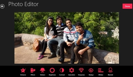 When you select an image to be added in the app you will be presented with a window as shown below that will enable you to enhance the image with ability to modify brightness, contrast, saturation sharpness, redeye, whiten, blemish, etc. and also you can apply effects and stickers with complete ease and simplicity. After you are done with the editing all you need to do is click on the done button and the image will be added to the collage.![]()
