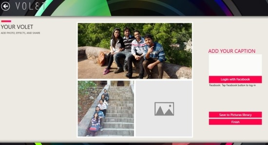 Volet is completely free app for Windows 8 that allows you to create stunning collage and share them with your loved ones, friends, and family. This app is very simple and straight forward in use, the app presents you with different layouts that you can use as the basis for your collage app then just load photos of your choice one by one and save the collage on to your computer or share it on Facebook.
