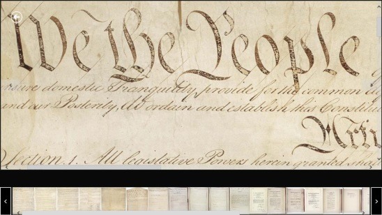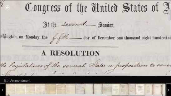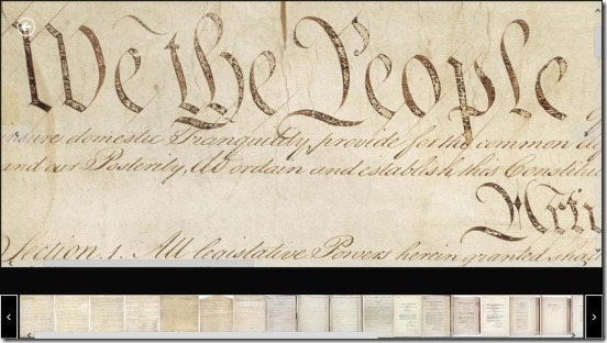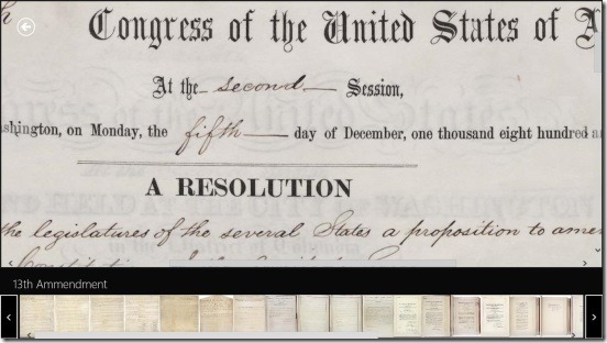 The Main Screen also consists of a button to View Actual Documents at the far left top of the screen. Simply click on it and you can view all the copies of original documents. Like I mentioned above, these copies are in high resolution photos of original. You can even read what is written in these copies. The images open in almost full screen mode, covering most of the screen. All though you can’t zoom in/out in Windows 8 desktop computers. But there are scroll bars, that can help you in viewing the complete photo. Also there’s a ribbon at the bottom. It lists down all the high-res copies of the original documents, that is: Articles, Bill Of Rights, and Amendments. Simply click on the desired image to view the copy of the document.