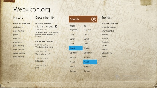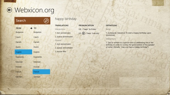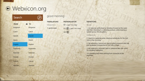 Webxicon.org is a Windows 8 Dictionary app. You can use it to conveniently get meanings for words and phrases. Along with that, you can get translation for that word or phrase in different languages. It provides translation, from and to, for a number of languages like English, Bulgarian, Czech, Danish, Dutch, and various others.