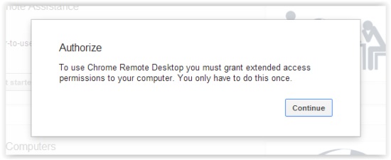 • Now launch this extension that you just downloaded from the browser. You will be presented the dialog; here you need to grant permission to this extension. Click on continue and complete the simple process.authorizing Chrome Remote Desktop extension