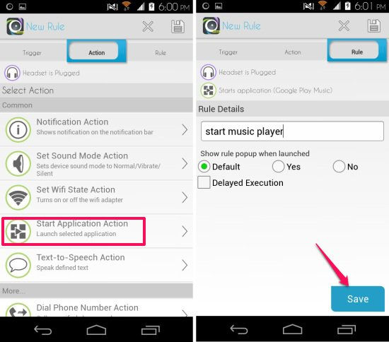 After this, the app will require you to select an action. Tap on the ‘Start application action’ option from the list and then select the music player which you want to launch. Now simply name the rule and then press the ‘save’ button in the interface. From now, whenever you plug the headsets in phone, it will automatically launch the music player.