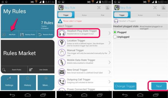 As an example I am going to create a simple rule here which will launch the music player when earphones are plugged in. To start, tap on the new rules button as pointed below. Now AutomateIt for Android will present you with the set of triggers as seen below. Tap on the ‘headset plug state trigger’ and then you will be presented with the options as seen below. Select the ‘plugged’ option and then tap on the next button.