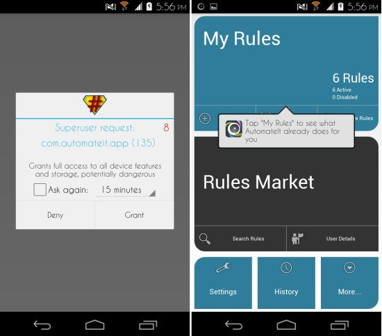 Most of the functions in this app work in non-rooted modes as well, but some required root permission If your phone is rooted, AutomateIt will ask you for the root permission, as seen here. Once you have granted the permission you will have main interface of app in front of you. I tested it on both rooted as well as non-rooted phones, and found it useful in both the cases.