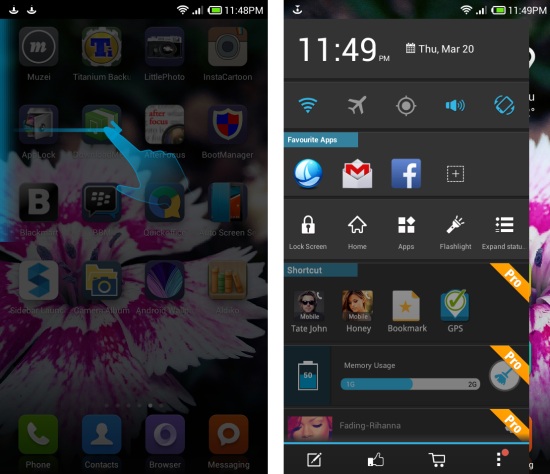 Sidebar Launcher for Android comes with two themes, one is dark and another light. You can also adjust the transparency. To access these setting, click on the menu option and then on “Look & Feel” button. Below you can see the app running in light color.