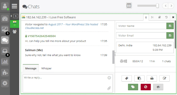 - Visitors Info: While chatting with a visitor, you can see various details like visitor’s name, OS used, browser, IP address, current page, location, chat transcript, and more.