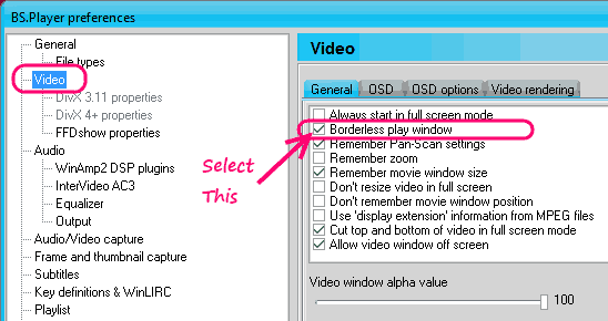 For this, right click anywhere on the interface of the player, then choose Options > Preferences. In the window that opens up, click on “Video” on the left side. Then on the right side, select option of “Borderless play window”. This will remove even that small border, and will make BS.Player truly borderless.