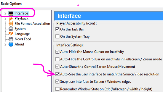 - There is a setting also that you can do to improve the experience. Right click on the interface of the player, and click on “Options / Setup”. In the window that pops up, select “Interface” from the left side. Then, on the right side, select the option that says “Auto-Size the user interface to match the Source Video Resolution”.