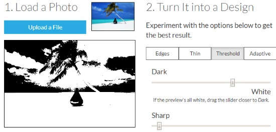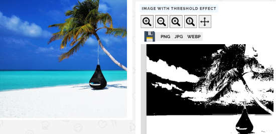 Among all effects, you will find a Threshold (Black and white) effect. You can use this effect to add a silhouette effect in your images. To do so, you need to choose an image file from your computer. Once the image is uploaded, you can use the slider to adjust the threshold effect.