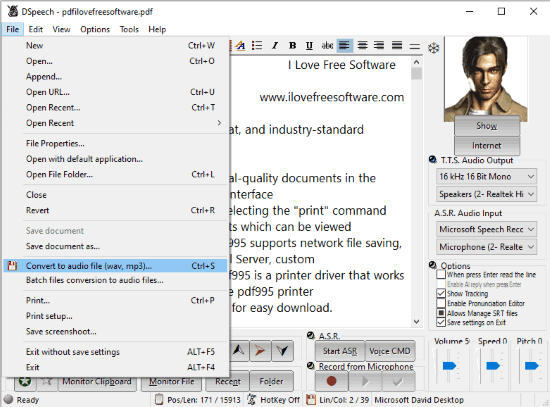 These features make it a much better software and a good competitor to another PDF to speech software covered here. Another interesting feature is you can set audio output level (16 kHz 16 Bit Mono, 16 kHz 16 Bit Stereo, 32 kHz 16 Bit Mono, 32 kHz 16 Bit Stereo, etc.).