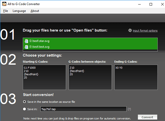 After getting the software from the above URL, simply open it. Import the input SVG file or files in it and then you can convert them to Gcode (TAP) file in just one click. Use the “Convert” button from the bottom right to start the conversion. Before the conversion, it lets you modify the Gcode snippet for the middle objects, end, and starting of the file. If you have knowledge of Gcode then you can customize that.