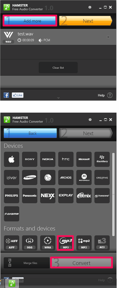 Hamster Free Audio Converter is quite a nice software that lets you convert a WAV file to MP3 based on devices like Apple, Transcend, BlackBerry, HTC, Samsung, etc. Additionally, you can also convert a WAV file to OGG, WMS, MP2, AIFF, AMR, and some others. The software has an intuitive interface and the conversion process hardly takes few seconds to complete. However, there are no options available in the software to specify output parameters for the MP3 file such as bitrate, sampling rate, etc. It just focuses on converting a WAV file to MP3.