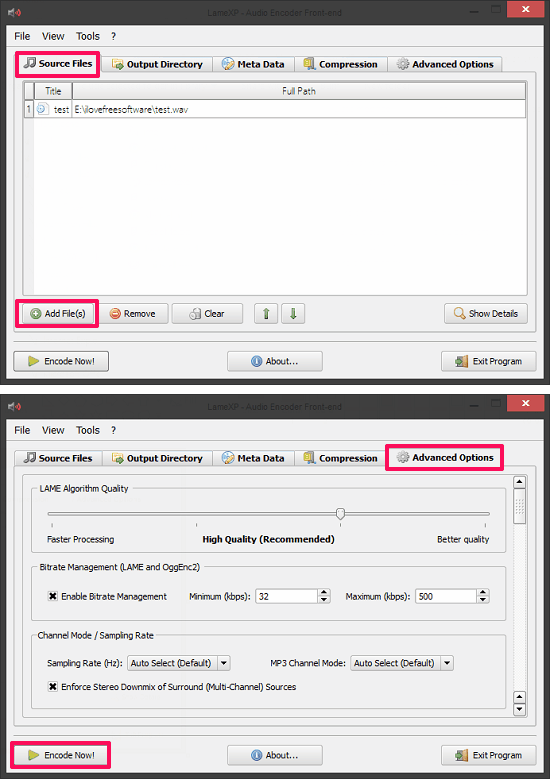 LameXP software has various tabs on it that you have to use to opt for certain options. You can download the setup of this software from its home page whose URL is given above. After installing it, run it, and you will see its interface. Use the first tab of the software to import WAV file or files. And then configure output parameters accordingly using the other tabs. Use the Advanced options tab to specify output parameters like sampling rate, bitrate, etc.