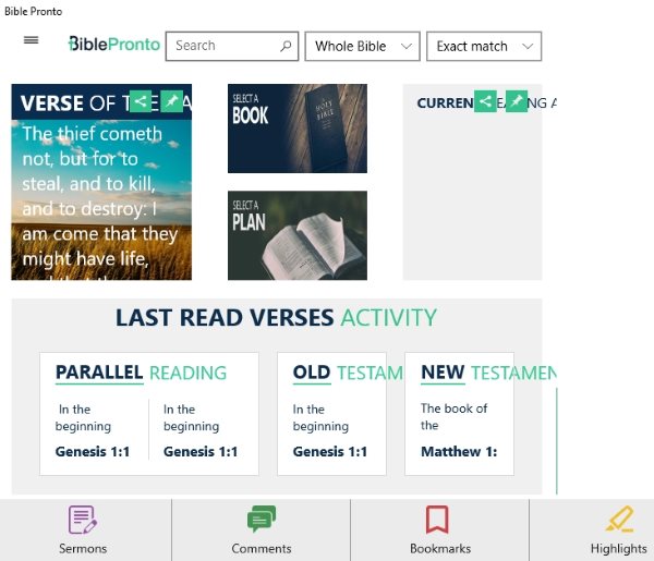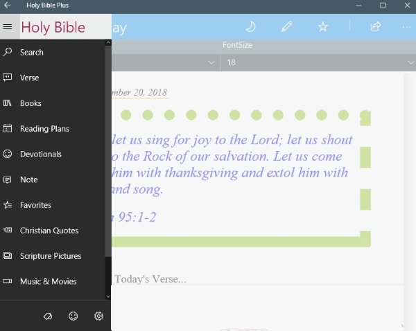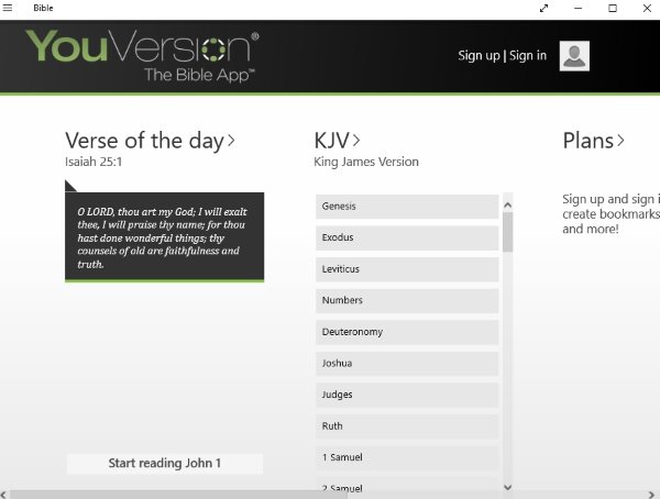 All the apps support various versions of the Bible and most of them are also available in many languages. The apps also come with reading plans which help you read the Bible consistently. You also get the option to share or favorite the verses that you like the most. Let’s look at these 5 free Windows 10 Bible apps to read or hear Bible below.
