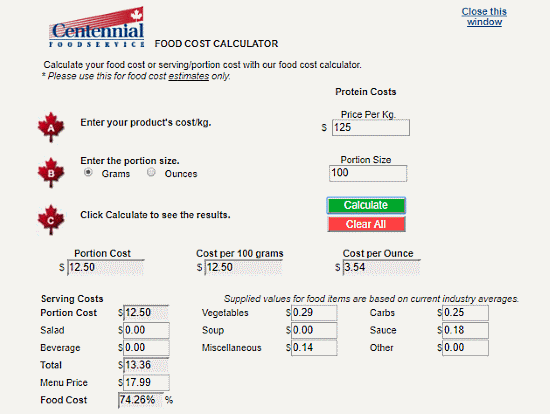Each of these websites offers a different type of food calculator. The first one lets you calculate the food cost based on each item’s price. Second and third help you calculate the cost per piece and serving per portion respectively. The fourth one helps you calculate a restaurant food cost by their ingredients. And, you can use the fifth one to estimate your weekly and monthly food cost.
