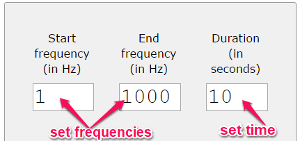 Step 1: To get started, simply browse the “Sweep Generator” homepage and there you will see the options to set the frequencies (start and end) and time duration (in seconds). You can enter any value you want in the frequencies and time field.