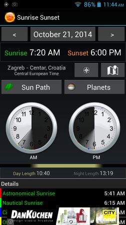 App also tells you day and night length, along a whole heap of more technical info like the astronomical sunrise, nautical sunrise, position of the Sun, Sun path, planet positions, and much more. You can see how the app looks like on the image above.