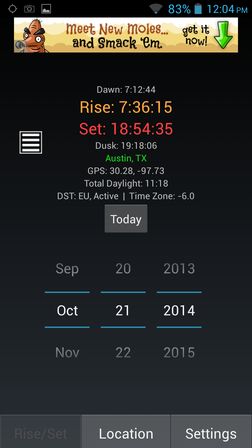 You can see the app in action on the image above. Location can be detected via GPS or you can type in your own locations. The usual info is given, sunrise, sundown, astronomical sunrise/sundown, etc.