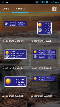 LunaSolCal Widgets is a sunrise sunset widget app for Android which gives you a large selection of widgets for you home screen. Widgets will tell you sunrise and sunset time without having to open anything.