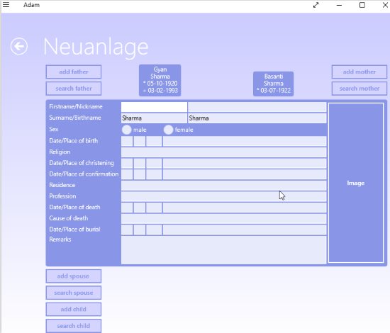 Adam Free is a free Windows 10 family tree maker app. This app starts with a pretty blank interface with just the option to add a new tree. Click on the new tree tile and a window like the one shown in the above screenshot will open up. Here you will start filing the details of your family and start adding.
